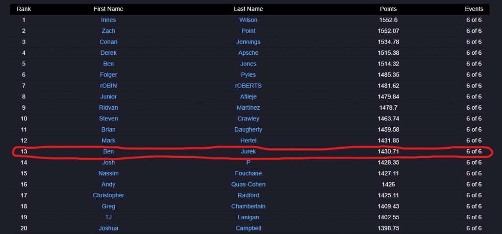 So while I’m not saying it isn’t possible for someone to play in lots of teams events (Innes Wilson is currently #1 and no stranger to teams events), and still win the ITC, it does hurt your chances. This year I definitely prioritized some teams events over big singles events and while I don’t regret it, if winning the ITC had been a personal goal of mine I’d have probably made slightly different choices with regard to some of the events I attended this year.