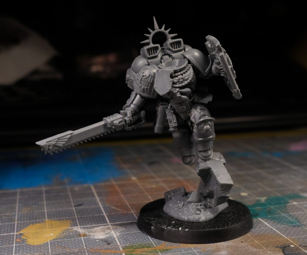 SRM: Speaking of, the only options here are a choice of Thunder Hammer or Chainsword, and a choice of bare or helmeted heads. Said Chainsword is basically Titus’ from Space Marine which is neat, but I would have liked to have another tilting plate or some other detail to make this model your own. I gave him a Templar helmet and stuck a Templar doodad on his hip, left the jump pack off for subassembly purposes, and was off to painting.