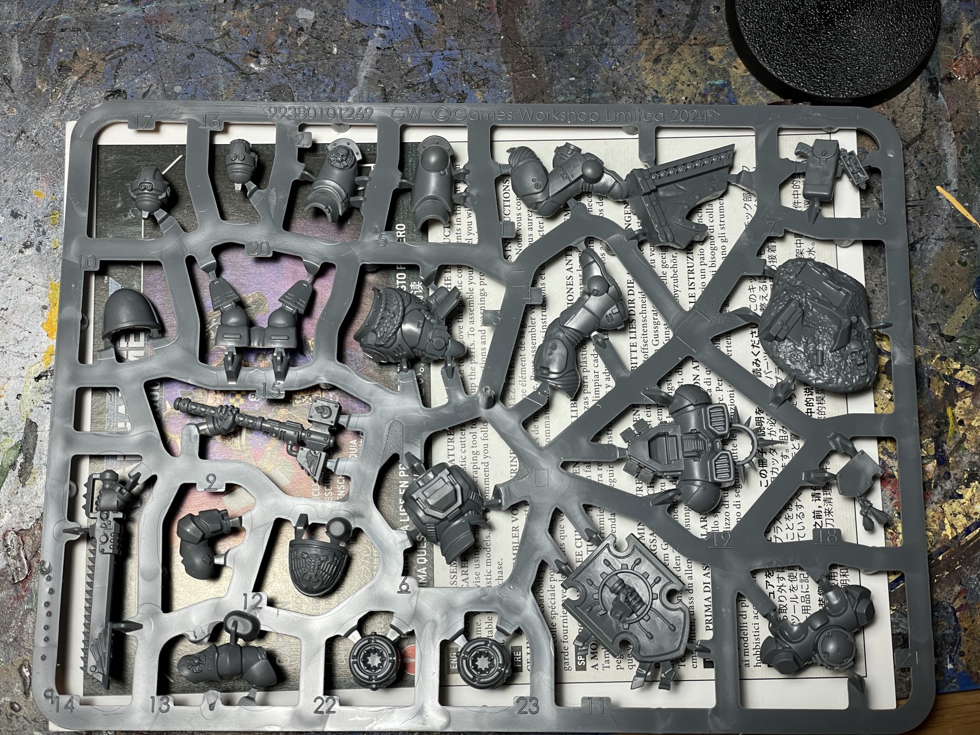 I painted in more subassemblies than SRM, keeping the tilting plate, relic shield, right shoulder pad (purely to paint it a different color, not for access), head, and jump pack separate. You don’t need to do that many, but I find it easier, especially for things that are going to be different colors.