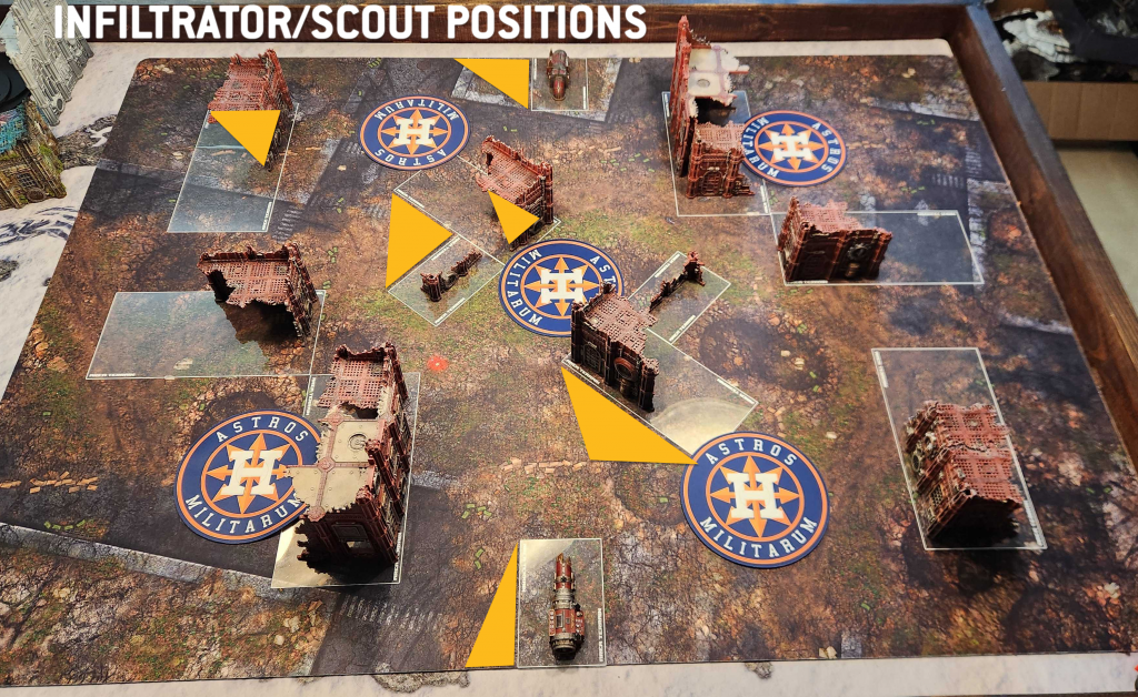 Where you can place infiltrators/scouts will depend on deployment map – you have to stay 9″ out of your opponent’s deployment zone – but generally speaking you have a few options here. That crook inside the smaller L ruins (D) isn’t just great for staging, it’s great for infiltrators and scout moves, and you can also hide inside that ruin if you have a smaller unit. Hiding behind the two small mid-table ruins (E) is also an option, but just be mindful that you can still be visible across the table if your opponent has something capable of shooting you from 36″ away. Hiding in the solo ruin (A) is also a common option for infiltrators, particularly on Search & Destroy, where you need easy access to the objective marker.