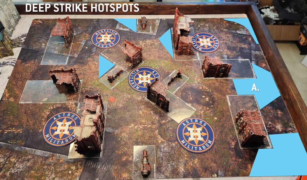When it comes to deep striking, that big L-shape creates some similar problems. As you move your units out of it, you leave a massive area behind it where units can drop in. That area labeled “A” up there is also a great spot for deep strikers who want to charge in, as it lets you typically drop outside the ruin (and out of line of sight of units on the enemy’s home objective). This is a very common drop spot on round 3, when units have typically moved out of that alley between ruins and toward objectives at midfield.