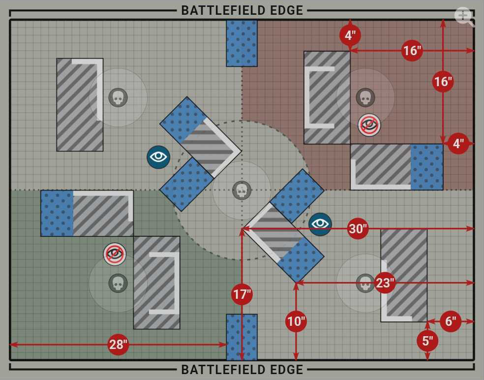 Note that on Crucible and Tipping Point, the two midtable objectives are placed 20″ away from the short table edge, meaning that the objective control range for each extends to 16.5″ away from the short table edge. This means that on either table, it will typically be possible to reach the objective from the 12″x6″ ruin if you have a 6″ movement characteristic, though with the realities of terrain width or a deployment 1″ back from the wall, a 5″ move will not be sufficient to bridge this gap, requiring slower units to Advance to make it to the objective.