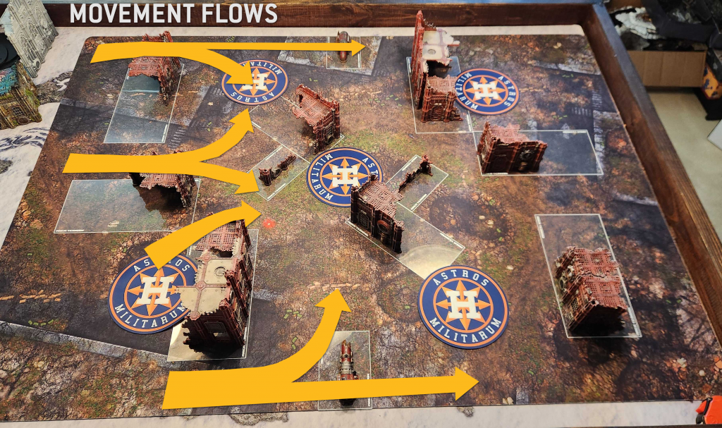 While infantry can generally move however they want through the ruins on this map, the terrain is naturally going to flow models – particularly vehicles – to one of three lanes. The most common area for staging here is inside the crook of the small L-shaped ruins (D) in the middle of the table.