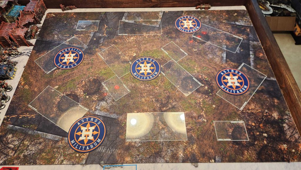 The big thing to watch for here is the corner overlap on those center ruins – they’re supposed to overlap the center objective by about an inch (or at least 3/4″), and so that means that if you have thin terrain like MDF you may be able to tag that center objective from the center ruins.