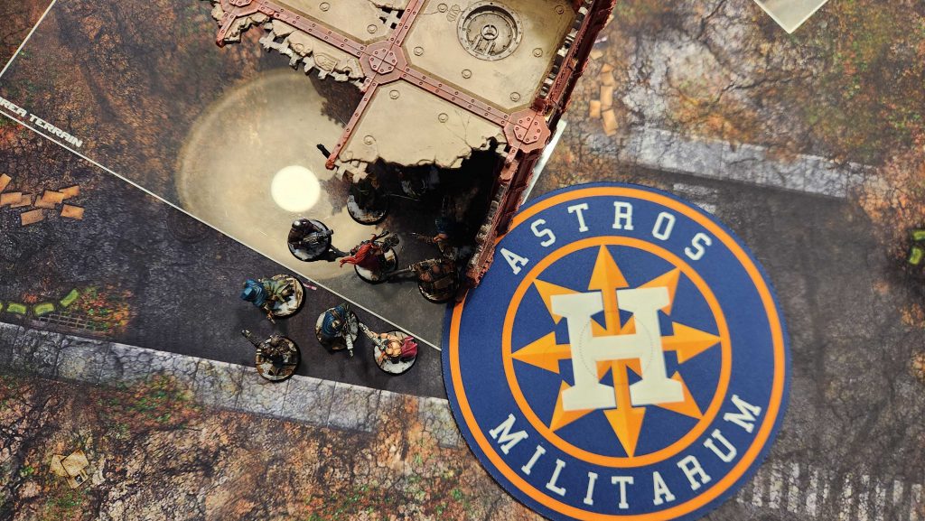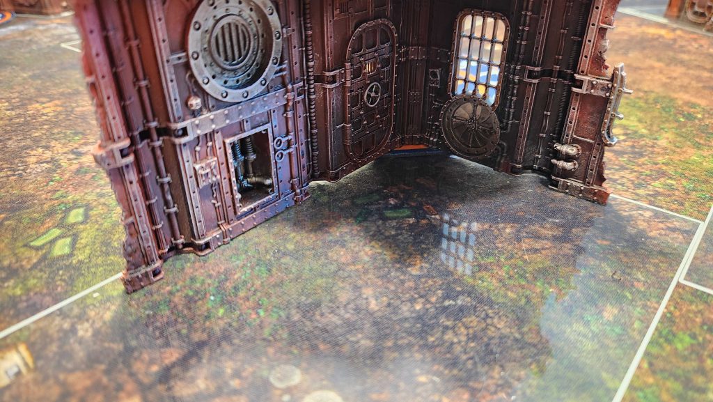 A. The slanted corner ruin. This is a 12×6″ area terrain piece, typically with a large/tall L-shaped ruin. It’s going to be an important piece on both Sweeping Engagement and Search and Destroy maps, and you can typically tag that lower left objective on either layout from inside that ruin. Though note that this is difficult on Sweeping Engagement and terrain-dependent. With what I believe was a “correct” setup, I could only “safely” tag the objective with about two cultists.