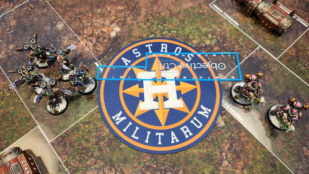 These ruins sit about 6″ apart, but if you have units tucked in each corner you’ll likely need an 8″ charge to close the gap from one ruin to the other across the objective. That’s plenty doable without leaving the ruin, so if you’re worried about Overwatch, you can take a risk on a slightly longer charge instead.