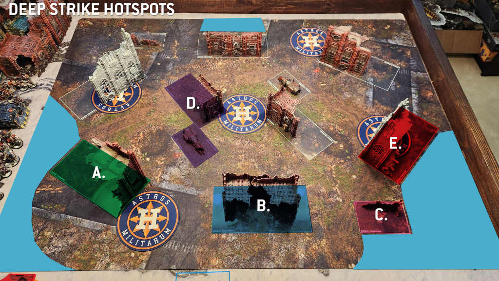 Being as open as it is, this map doesn’t offer nearly as many great deep strike spots as most other maps. The corners are really going to be the most common spots here, and even then those long sightlines down the sides of the table make those somewhat impractical. As a result, your deep strikes will typically be a bit more dynamic on this layout, and dropping down in front of the enemy instead of behind will be a bit more common unless they’ve over-extended.