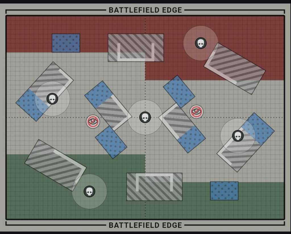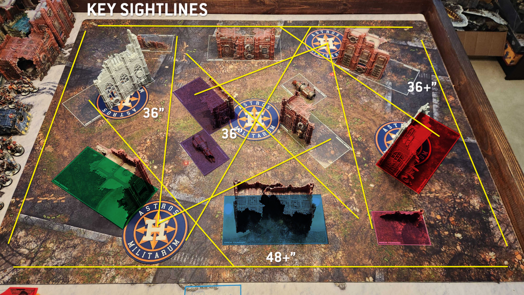 Across the middle of the table you have a relatively easy line you can draw through the three objectives on Sweeping Engagement. This won’t be an option on Search and Destroy, but the diagonal sightline will still be available, and generally you can get shots across the middle from either direction as needed – it’ll just be a question of which objectives you’re drawing a line between.
