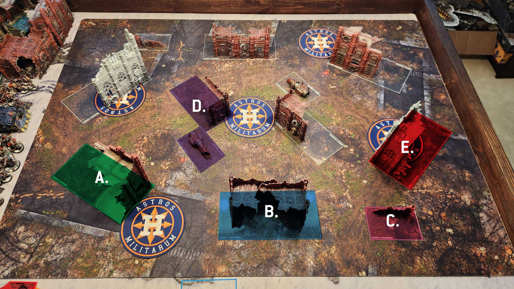 E. The other large slanted ruin. This one will never be in your deployment zone. It combines with C to create another set of solid cover on Sweeping Engagement. It’s also going to be a key piece of cover for masking deep strikes and Infiltrators.