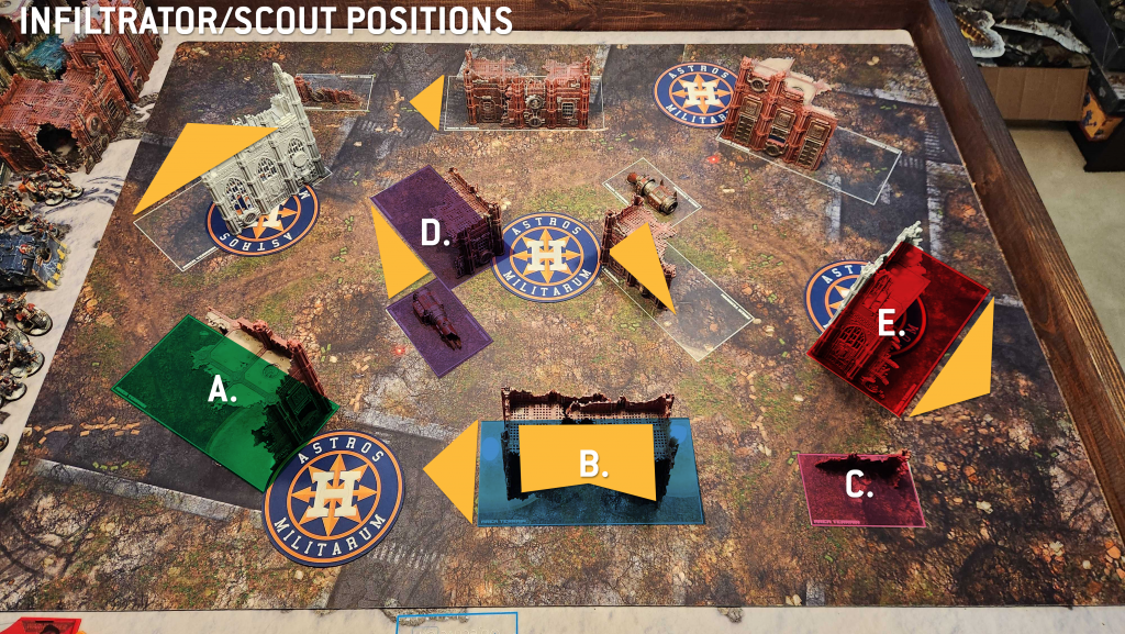 Those center D ruins also serve as strong spots for your Infiltrators and Scouts, letting them set up for solid positions, and setting up on the center objective with infiltrating scouts who can them move forward or backward depending on whether you have first turn is a solid play. The side E ruins also serve as good protection for infiltrators, and they can usually hold the objective in that ruin somewhat safely – it’s harder to do on Sweeping Engagement.