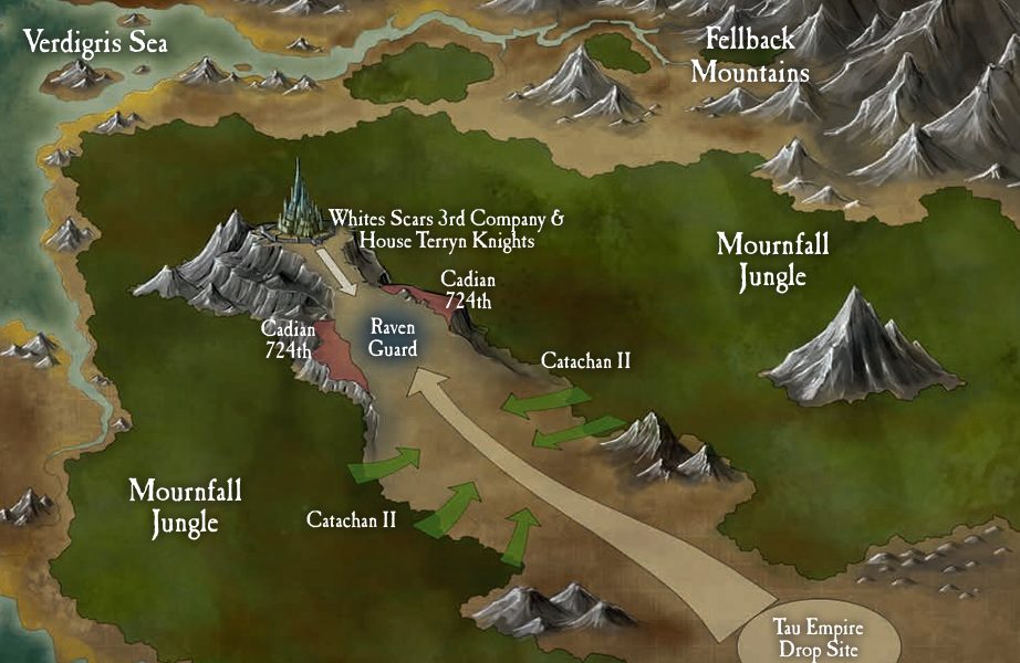 As the Imperial Fleet broke orbit, the T’au had already begun to settle their newest T’au sept world, which they named Mu’gulath Bay. Meanwhile, the Imperial forces regrouped, holding a war council on Severax’s flagship. They chose to withdraw to House Terryn’s home world, Voltoris, where they hoped to draw the T’au into attacking the planet – its only inhabited area was a single stronghold atop a mountain named Furion Peak.