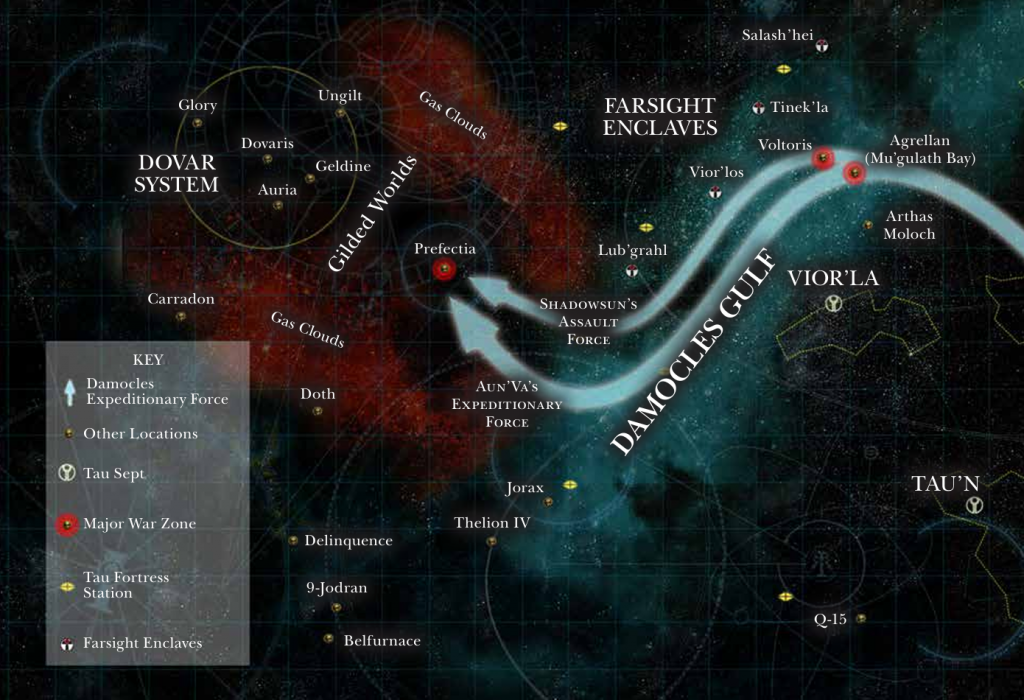 On the T’au side, it was time to figure out next steps, and war councils debated how to proceed. The T’au renamed Prefectia “Vas’talos,” which means “boundless scope,” a clear signal of the belief that unbrided expansion was around the corner. Many of the Fire Caste believed they should consolidate their gains, but Aun’Va overruled the council, saying that the expeditionary force would divide its strength, one half pushing into the Dovar system as the other half returned to fortify their supply routes to Mu’gulath Bay (formerly Agrellan). On the T’au comms channels word was already spreading of their great success, and of Shadowsun’s victory on Prefectia. They reported that the grand monarch of the Space Marines had been slain, a grim-faced figure in black armor. And they reported on the devastating new war machines which had brought that victory, the Ghostkeel and the Stormsurge.