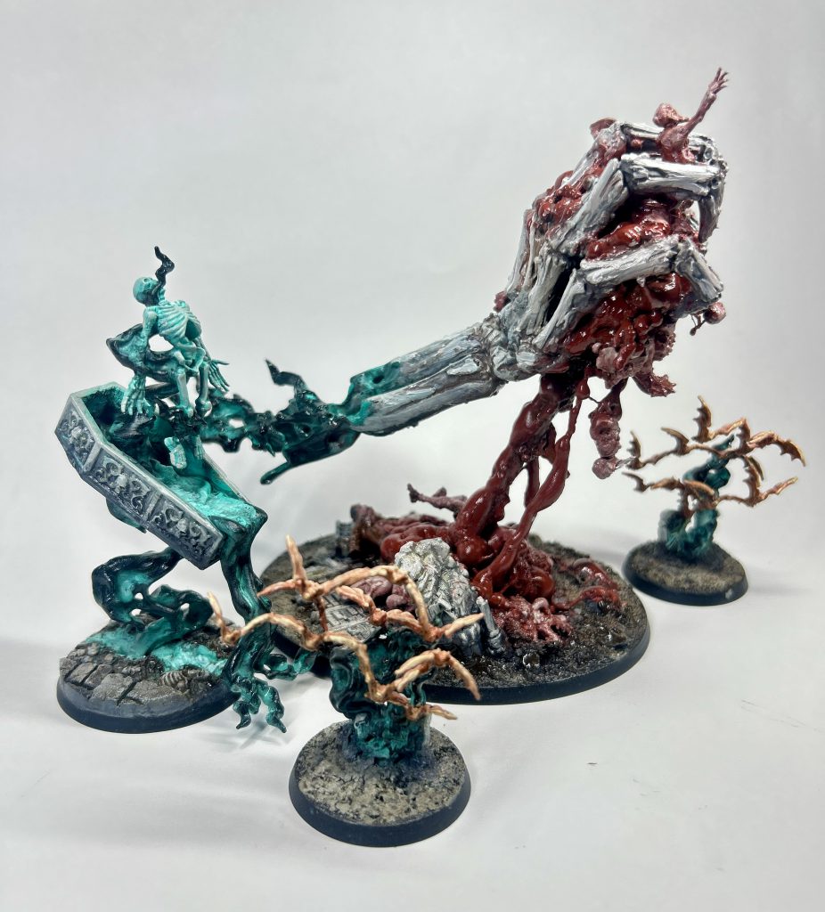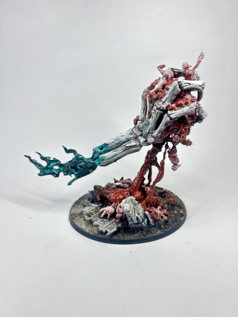 The HAND OF NAGASH is boss. Big floating death hand coming RIGHT at YOU! What’s not to love? Every set of Manifestations has a star and this is clearly the Soulblight one. HANDS down. The Hand is supported by and protruding from a swirling vortex of death energy. Easy build and not many parts, the vortex being only two pieces. This was a little much sculpted magic for me however and I therefore set about my only kitbash of this set. I nearly just had it bursting from the ground, Evil Dead style, but in the end went for a variation on the ‘coming right at you’ build. I closed the fingers up a little, cutting and pulling them together, to make more of a grip. Then I added a stream of corpses and bloody matter cascading from the hand. This supports the whole thing on a brass rod up the middle, meaning I could drop the magic vortex and make it more horrid in one go! Most of the gore lumps and stream is made from various bits stuck together and then bulked out with expanding polyurethane glue. I like doing experimental, unpredictable builds like this, the expanding glue gives a random element that is fun. Came out pretty well. Certainly grim! I like this model and it makes a dramatic addition to the army.