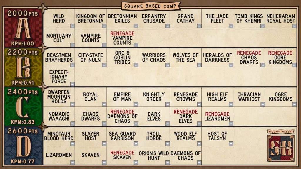 As previously mentioned, some comps are simple, like my cousin David who thought the finger bowls provided at his wedding were dip for his biscuits. There is a delicate balance when it comes to managing the game for players and keeping it accessible to a wider audience that often leaves more casual tournament goers at a bit of a loss. The Old World is an extremely complicated game as it is and layering additional rules and restrictions on its armies can be a bit too much for some people. Enter the new(ish) Square Based comp. Previously known for their Renegade Faction rules pack that adjusted army rules for Legacy factions to try to make them a little more balanced versus their supported counterparts, the Square Based team has also built their own comp system for testing and it has already seen some use at events (like the recent Cali Cup).
