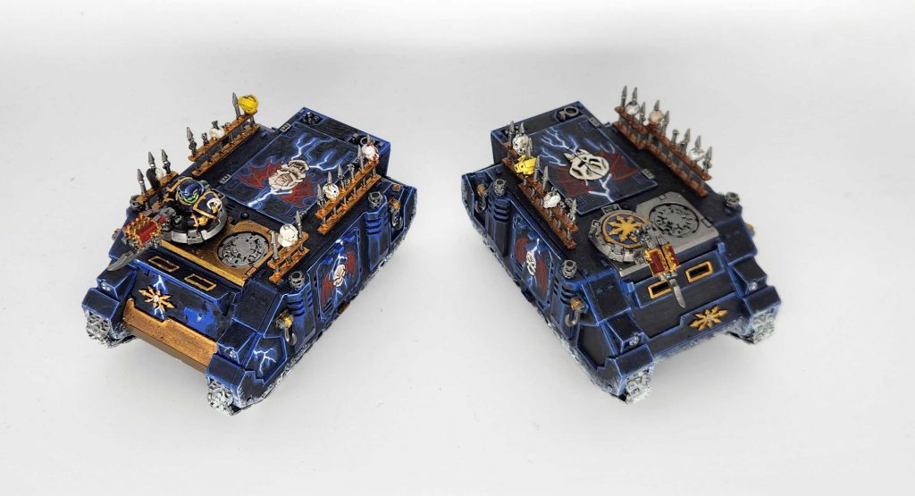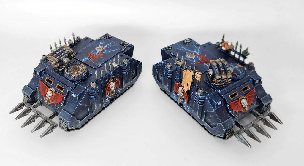 I needed some new transports, of course. So I painted these three Rhinos. It took me a long time to source the original Night Lords Rhino doors for the latter two, but it was worth it – nothing quite matches the detail and character of those old Legion Rhino upgrade kits with the Wayne England art made real. I decided after the first Rhino that I wanted the sideways skull with a single wing to be the personal heraldry of Anrac Shan’s warband.