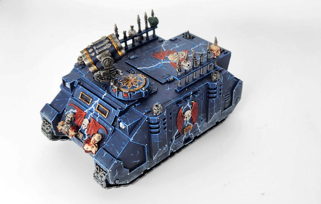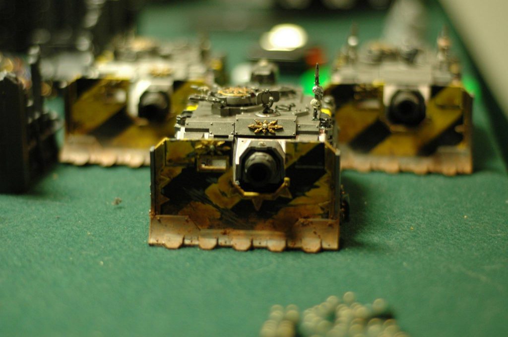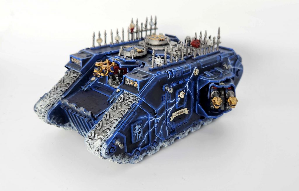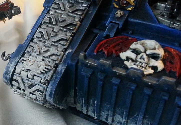 If the front panel of that Land Raider looks rough it’s because it used to have a big green stuff chapter icon I sculpted on there. It looked absolutely terrible, so I scraped it off with the notion of doing a freehand replacement. But in the end I decided just to paint an entirely new Land Raider instead. Here’s the green stuff if you want to see it: