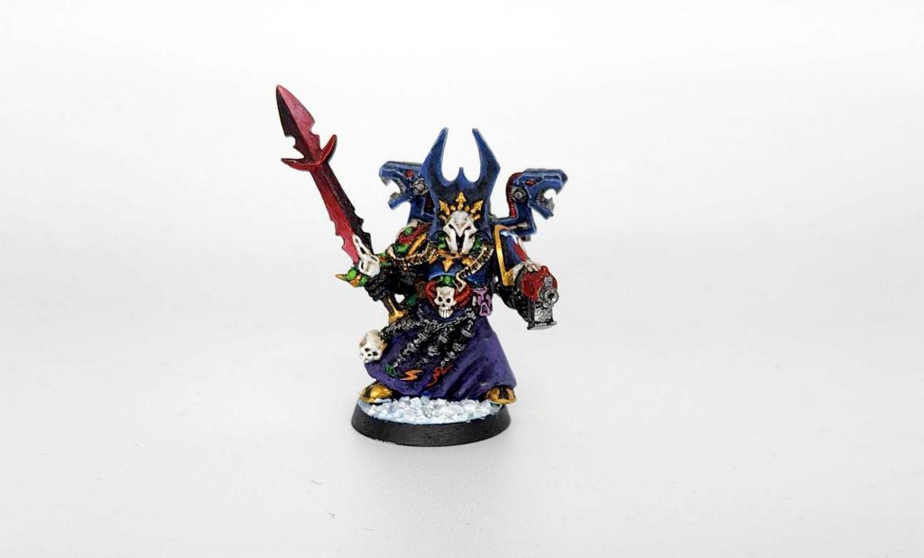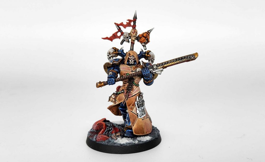 Apollyon was the Chaos Lord I was running and rather than just run him as Abaddon (the model he was built from), I ran him as a Chaos Lord in Terminator Armor with every single mark, psychic powers, and a retinue of badass terminators. He was incredibly imposing… right up until turn 2, when an Eldar Swooping Hawk Exarch would inevitably drop into the battlefifeld nearby and lob a vortex grenade his way, killing him and his entire retinue. He’s a relatively simple conversion – just Abaddon with a terminator champion headswap and lightning claw – but sawing off that metal lightning claw from its arm was a massive pain in the ass, let me tell you what.