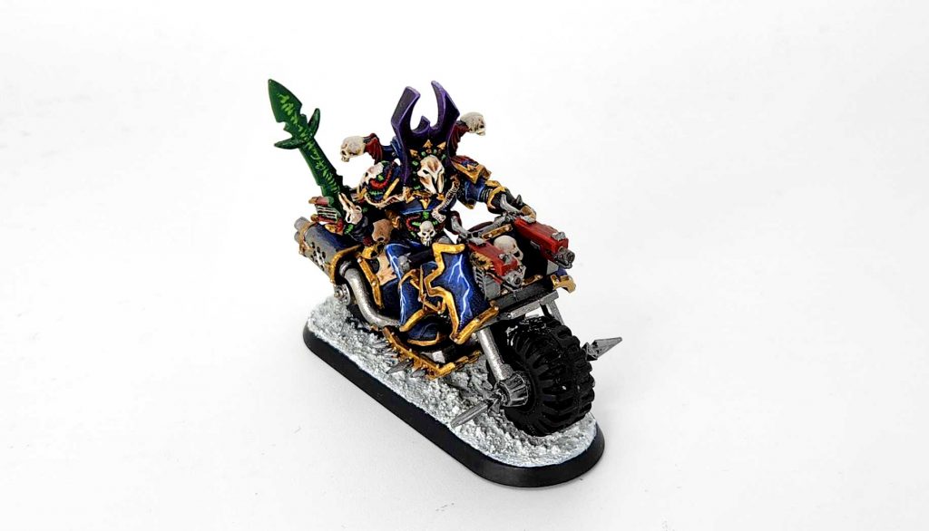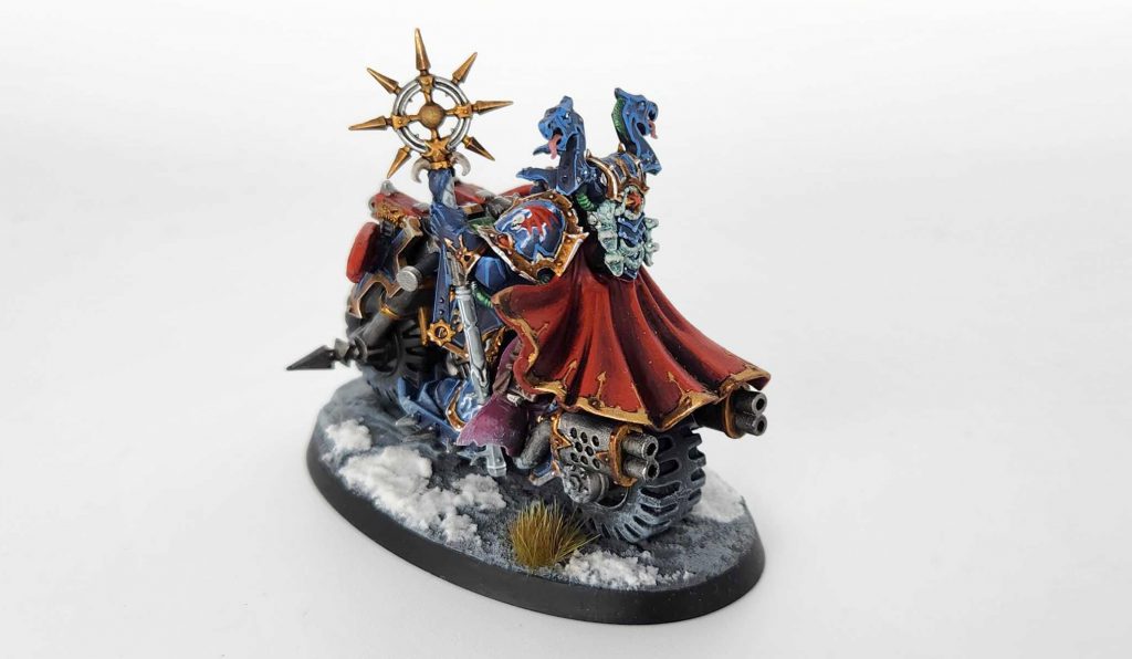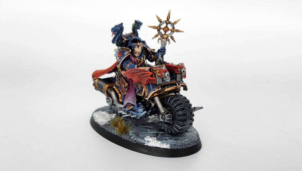 I also converted up a sorcerer on bike for them. This remains one of my favorite conversions I’ve ever done – all the little elements of this one still tickle me, from the Night Lords champion backpack (unused thanks to giving my guy wings) to the spellbook on his bike, taken from an Inquisitor model.