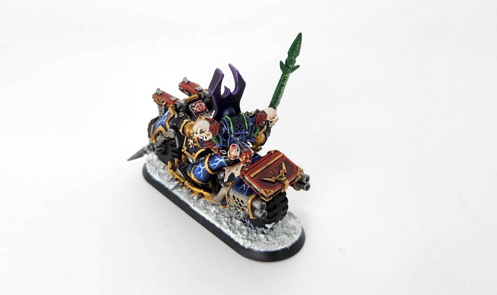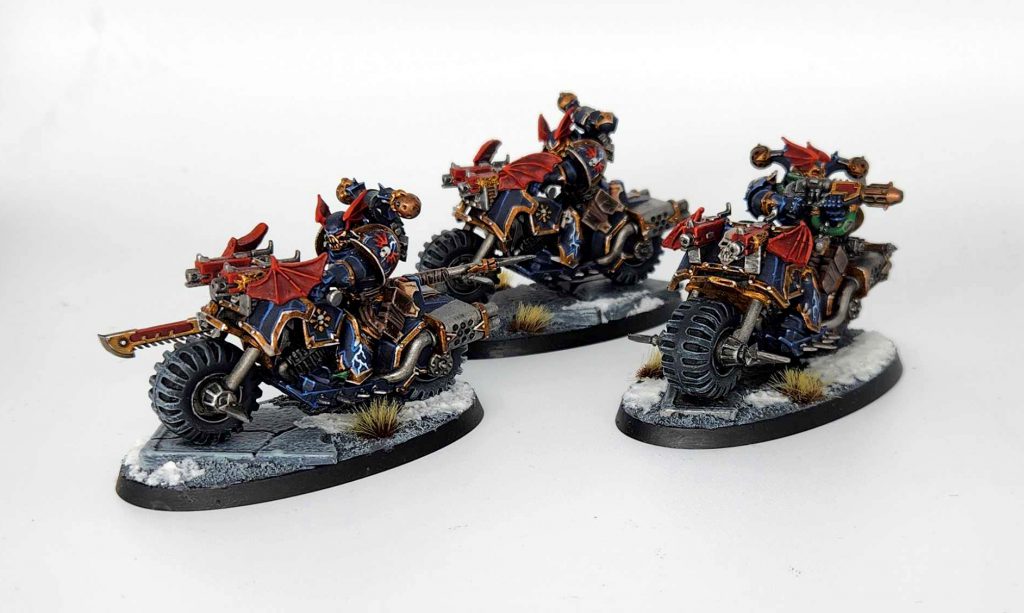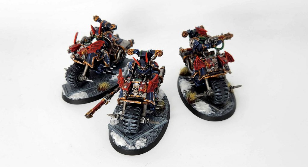 I did three of these and I’m incredibly happy with the result – they look great and are super eye-catching but there’s just one issue with them: They might be too good – if you didn’t know there weren’t modern Chaos bikers you might think these were official models and then not even know they’re conversions. That’s the ideal in my mind, but can also hurt you sometimes with paint judges. I finished the bikes off using finecast helmet wings from the old Night Lords upgrade kits. They’re too bulky and silly to use on helmets now, but they make great ornamentation for vehicles and bikes – just slap them on either side of a skull and you can get a striking visual effect.