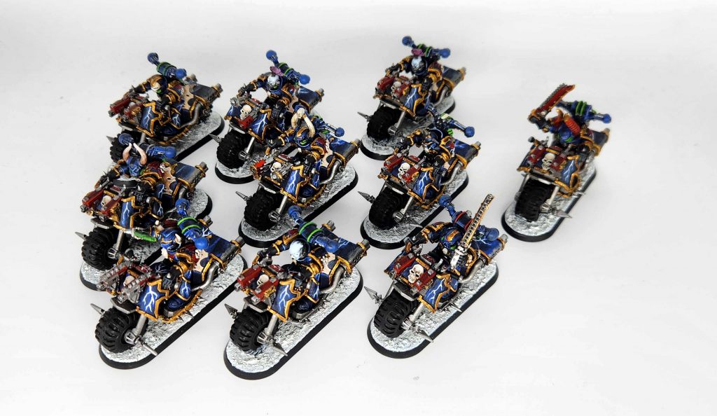 The other big project I undertook for this army was making Chaos Bikers. I really wanted to do new Night Lords bikes, but the challenge is that the old bike models looked terrible. The bikes themselves were OK, but putting a modern Chaos Marine on a bike is a lot of work. I ended up having to cut their legs in multiple places and use green stuff fills to make them work with the new bikes.
