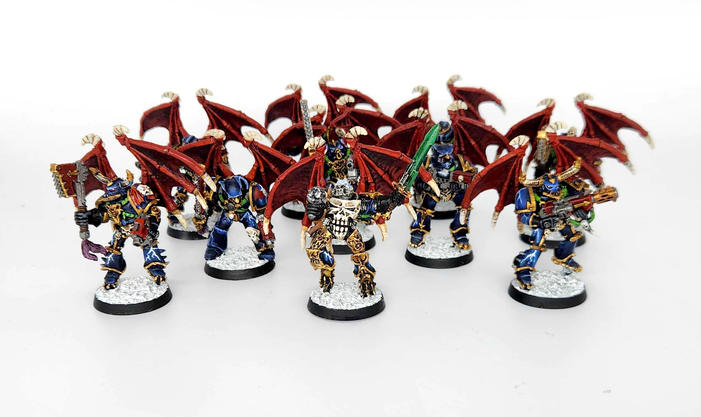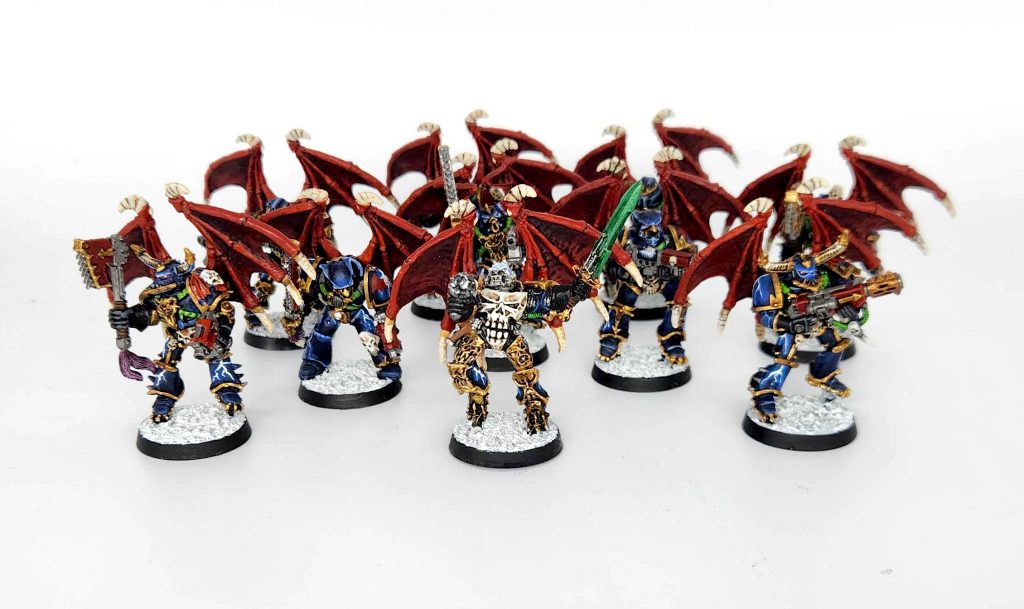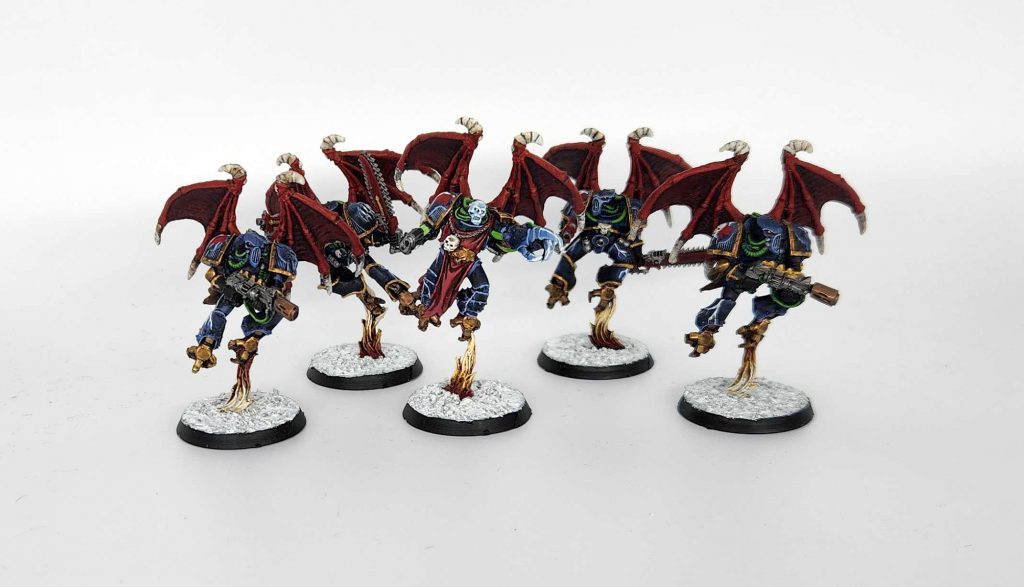 I updated my older five Warp Talons and added five more models, giving these the heads from the Heresy Night Lords. It gives them a lot of variety and I really like the skull-faced beakie helmets on them.