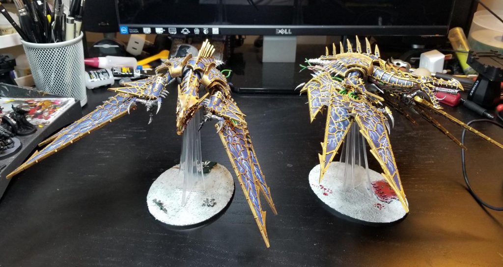 I’ve tried to keep the whole thing in a second edition style, with brighter colors and red bolters and green cabling, because that looks great. And it’s something I had planned to continue. Some time in 2020, right before the Pandemic, I painted these Warp Talons: