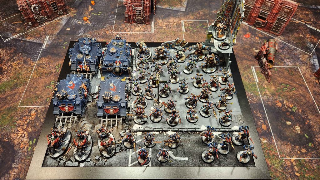 Not winning best painted in 2024 left me with a sour taste in my mouth – mostly, a realization that a black armor army just wasn’t going to be able to win best painted at a large event. I needed to go bigger and brighter. And as luck would have it, in April of 2024 Kill Team: Nightmare released, giving us a brand new Night Lords upgrade kit for Chaos Space Marine legionaries. I was immediately hooked, and I’m pretty sure I bought half a dozen of those boxes just to get night lords bits. I started working on a new, updated Night Lords army with the goal of winning best painted that year at the Grand Narrative.