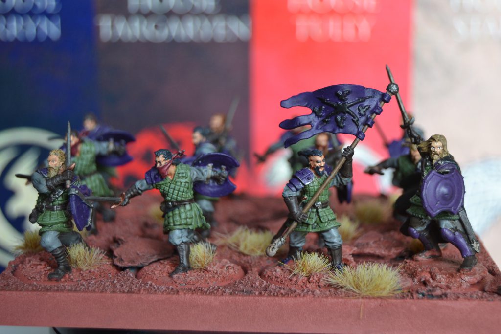 The Stormcrow Mercenaries have been converted with new shields featuring the sigil for the Golden Company and spears for their weapons to match the spear in the sigil. It feels odd to me that their main symbol has a spear, but nothing wields it, but a 5pts spearmen Unit for a Mini-Faction Golden Company box would work so well.