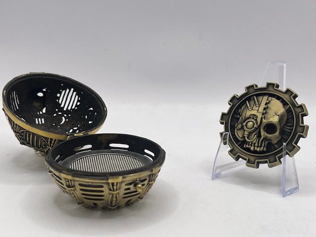 Here they are, side by side with the thurible opened up to reveal the burning grille. Starforged actually sells incense for them, and they’re shaped like little skulls. Omnissiah be praised!