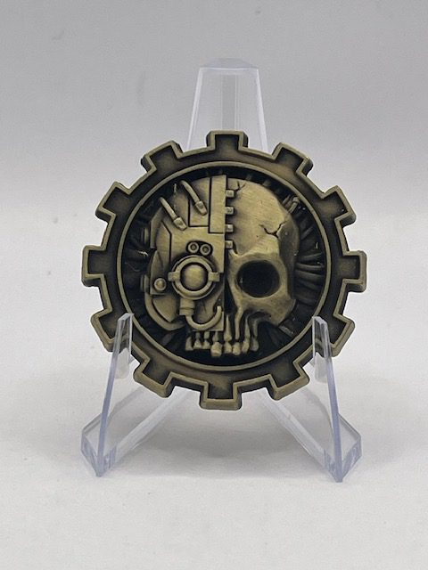 Here’s a close-up of the lovely AdMech Starforged metal pin, and the cogs make it sit perfectly in the display seat. It’s solid and heavy, the kind of on-brand durability you’d like to see for your AdMech art. Starforged makes officially licensed Warhammer merchandise, and chances are you’ve seen some of their more common items (bottle openers, Legion banner fridge magnets, etc) on a display at your local Warhammer Store.
