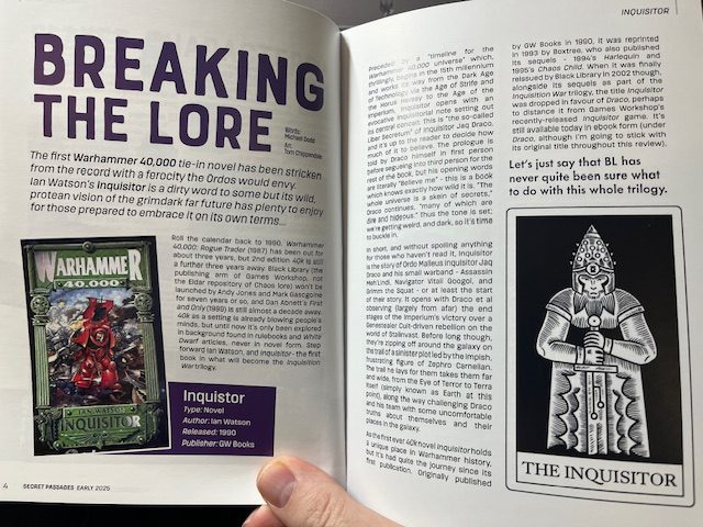 A zine that bills itself as being for “graph paper and bright green flocked base generation” of classic gamers, I picked up the debut issue of Secret Passages recently and what a treat. That’s right, a full feature on Ian Watson’s Inquisitor.