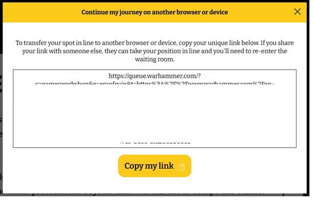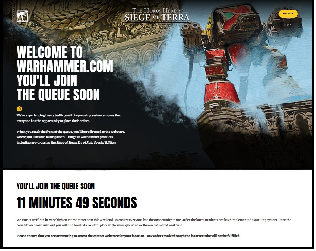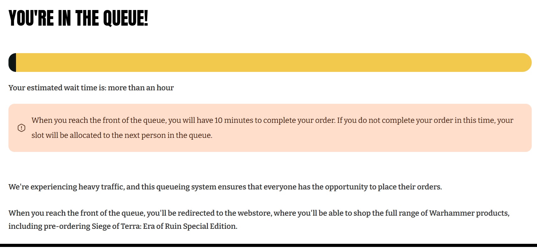 Sadly, all three of my browsers showed a wait time in excess of an hour (which a small part of me I’ll admit felt like karma for having three browsers up to begin with). I checked in with the Black Library groups on Facebook and Reddit to get a sense of the lay of the land. If anyone was under an hour, they were keeping it mum. It seemed like everyone actively posting was getting the same message.