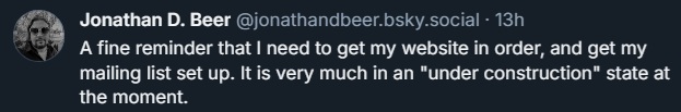 Admittedly that’s a fairly low bar, but it doesn’t take much to give yourself a proper digital island in the aether for those wanting to learn a little bit about you and your works. A bio, a list of your work, and perhaps a way to let folks get ahold of you if needed.