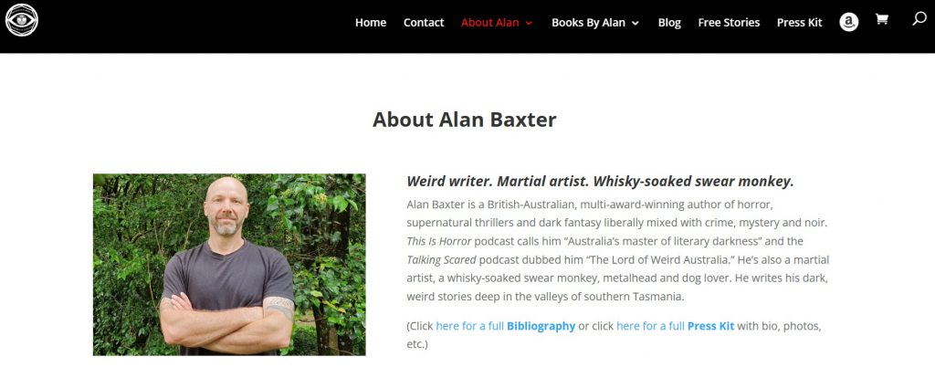 - This is the perfect illustration of what I’m talking about with the writer pages. If you hadn’t heard of Alan Baxter before, you might not remember much about him being award-winning or even British-Australian… but “whiskey-soaked swear monkey?” That stands out- and it’s straight from his own author page.