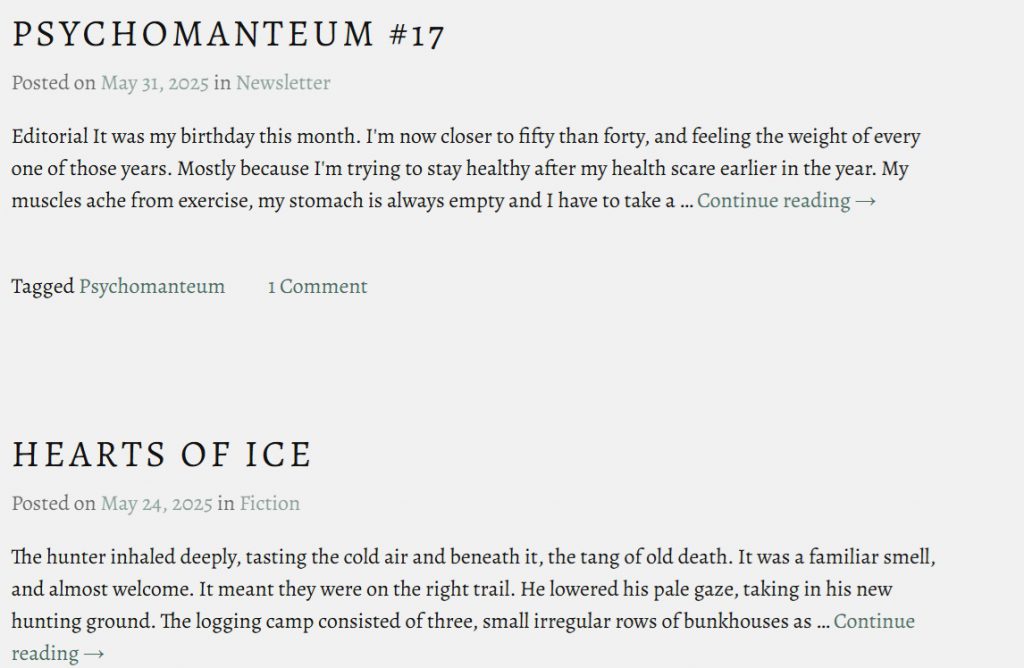 From the outset we can see that Reynolds is a fairly steady contributor to his own blog, which makes for lots of opportunities to connect with his audience. He shares both regular news as well as new fiction here, adding in movie reviews and other essays to boot.