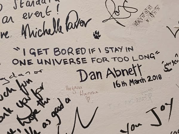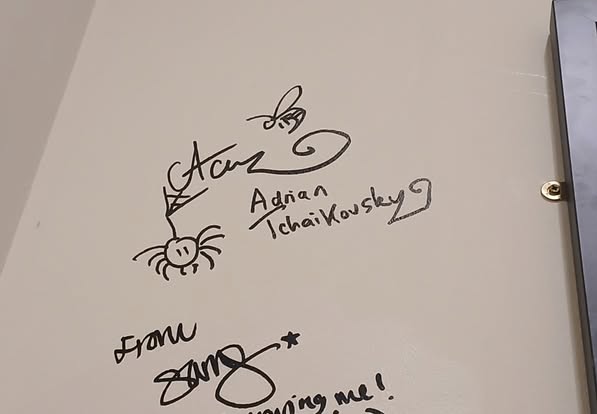 Here’s a random treat. Black Library reader Jack Robson was strolling through his local Waterstones (a UK bookseller) and found some author graffiti in the stairwell. Notice anyone familiar?