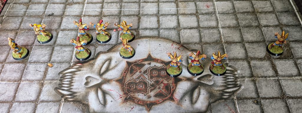 Most bash teams want to control the middle of the field. They know they do not have the movement or Agility to cover the breadth of the field, and they want to keep our defense as honest as possible before they make their move. When we set up asymmetrically we are presenting them with a challenge: Will you change your plan so that you can still block us? Are you prepared to risk a position where a failed pickup or a Blitz kickoff result will give us a huge scoring opportunity?
