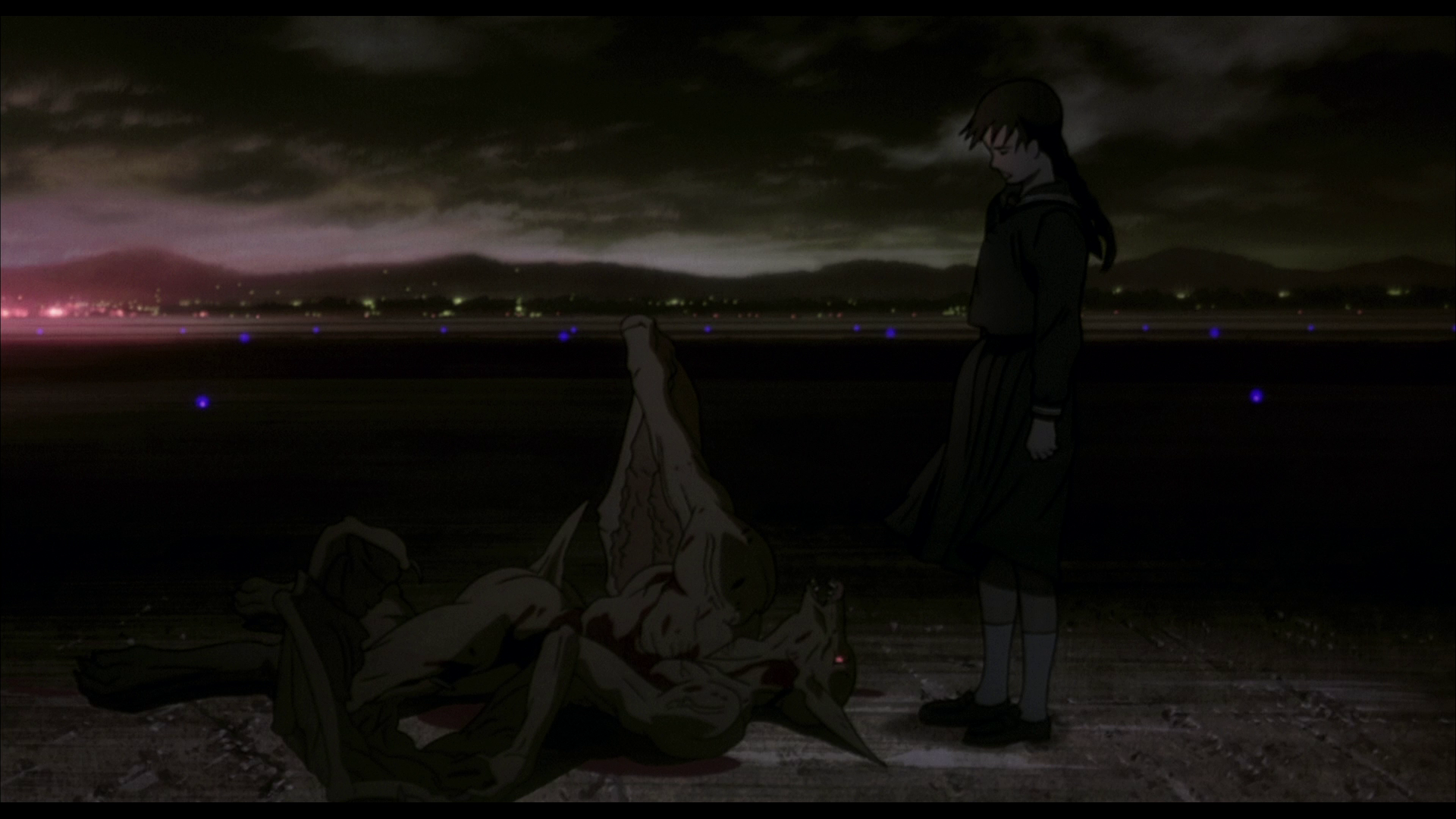 The story for the OVA is pretty direct: Saya kills a man on a Tokyo subway train because her American government handlers tell her to; it’s unclear whether or not this man is actually a demon, and this never-resolved question is the only real mystery in the plot. She is told she is to go to Yakota Air Force base in Tokyo where she has been given cover on the base’s high school for American military brats as a prospective incoming student; there is a chiropteran there that needs killing. She discovers there are in fact three — two of them posing as girls her apparent age and slaughtering classmates in the nurse’s office, and a third posing as the madam of a hostess club that panders to American GIs just off the base. The two “girl” demons attack the school nurse; Saya kills one and forces the other to flee, breaking her sword in the process — she leaves to find another from an antique store she saw earlier in the day, and the nurse foolishly chases the chiropteran into the base’s Halloween social. She corners the demon on the dance floor and Saya barges back in to try to save the nurse a second time, only to discover the sword from the antique store is a fake. In a dreamy sequence focusing on the military band playing jazz on stage, the chiropteran forces both outside without anyone in the busy dance hall somehow noticing; Saya drives the beast off with the fake sword anyway and she and the nurse flee to the motor pool. Meanwhile, her support team chases the one remaining chiropteran across the base to meet them at that location. David has located a real replacement sword for Saya and delivers it just in time for her to kill the second of the monsters, and then they chase the fleeing third beast down the airfield as it attempts to hitch a ride on a departing plane. Saya cuts it down and, as it lays dying, feeds it a few drops of her blood; it immediately expires. In the film’s coda, the nurse is being interviewed by people from the American government about what happened; the entire affair has been covered up, but she’s shown a picture of Saya from 1892 labeled VAMPIRE and asked to confirm if this is the same girl.