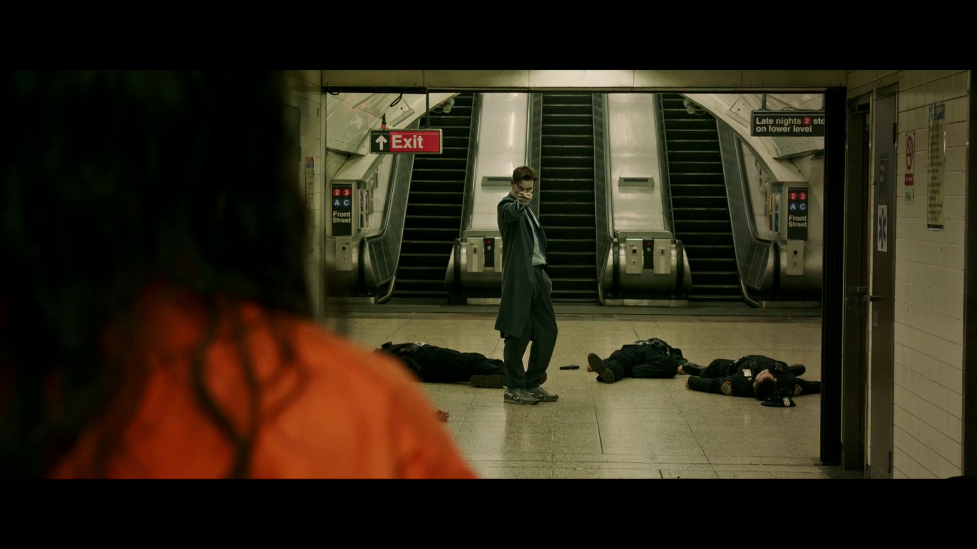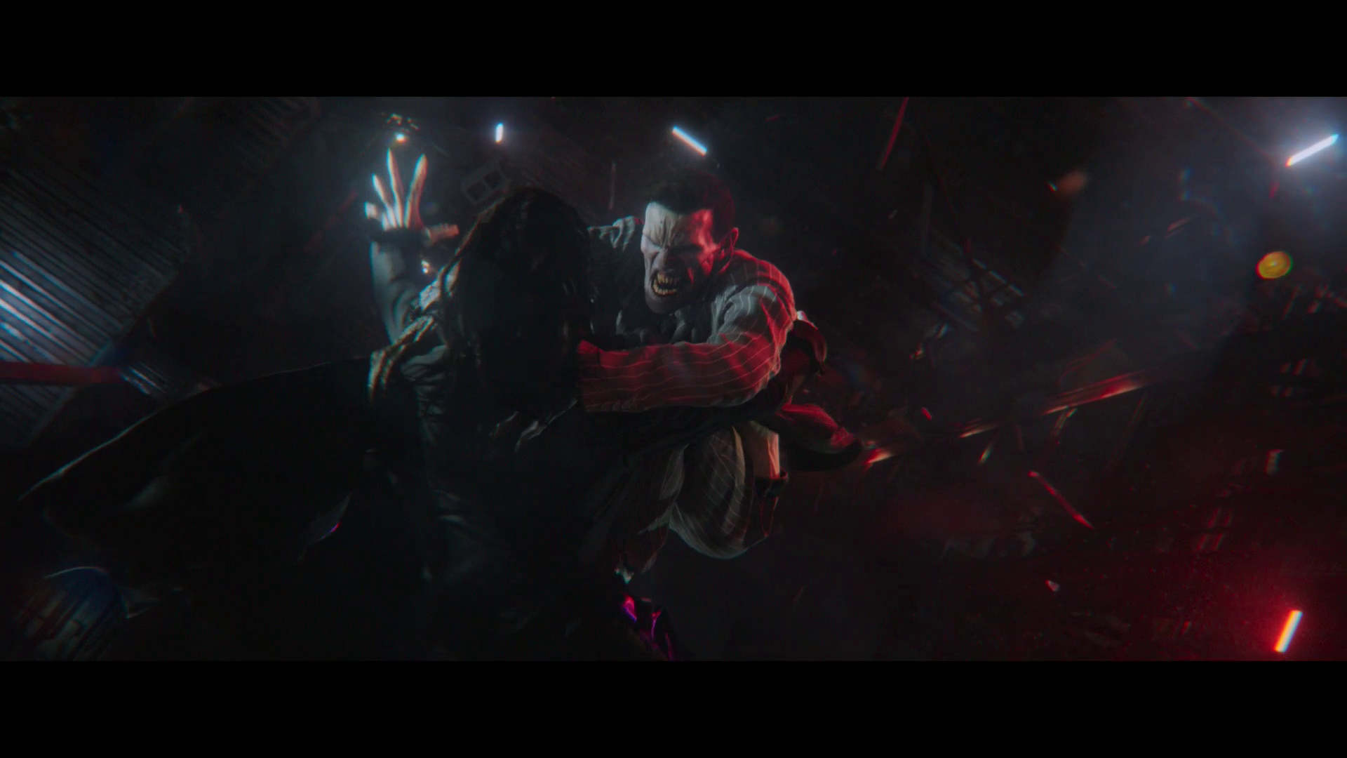 This is the best stretch of the movie by far, starting with the nurse kill and going through what happens next, which is that Morbs figures out the play and instead of coming up with a clever plan to sneak out of jail or counter-ruse Milo, he simply smashes his way through the barred window and flies out into the night, flexing his own vampire superpowers. Milo, who is expecting Morbs to do this, has been marking time by killing a newspaper vendor who he baited into saying something vampire-phobic to him, as you do. They face off, do the requisite, “But I was your brother!” bickering, then head into the subway for the best scene of the movie, a slugfest where both guys are basically just Superman-type “they’re really strong, they can jump a lot, they’re tough, they punch real hard” bruisers but everything has Vampire Seasoning sprinkled over it: Lots of threatening purple auras and echo-location CGI and weird eyes and teeth and claws. Milo kills a bunch of transit cops. It’s pretty solid stuff! If you wanted to see what combat Disciplines from the World of Darkness tabletop game Vampire: The Requiem looked like done up with a full budget, this movie’s got Celerity, Vigor, Resilience, Protean, Auspex, and by the end Animalism all on full display — for this scene, the final fight, and maybe one or two other brief spots. The rest of it is a lot of Jared Leto trying to carry scenes.