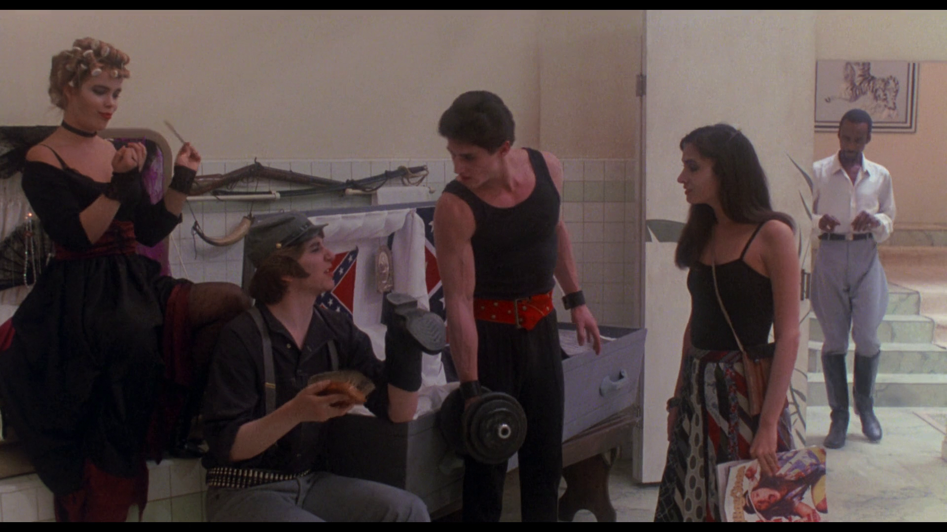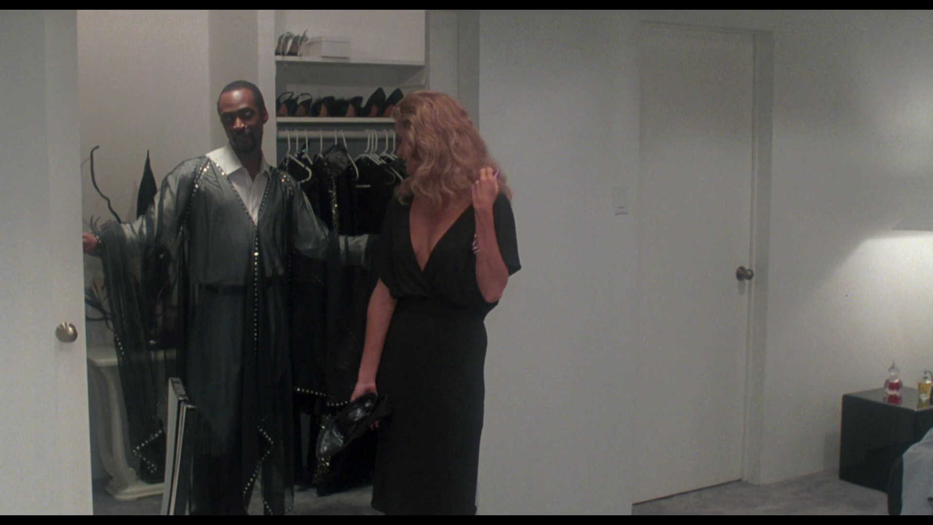 So is the production! The lighting is generic studio-shot TV sitcom lighting, even as they shoot on location at this big house in the hills they’ve commandeered for the 45 days of production they had for this pile; the transitions and shot framing and shot composition and just everything about this whole enterprise screams “television,” and there’s a reason for that. Director Howard Storm has 53 credits in that position between 1975 and 1999; all but two of those are on television shows or made-for-television movies. This is one of his actual film projects. The other? Penthouse Video Magazine, Volume 4. Storm is what you might tactfully call a journeyman of the television business; he would never get another shot at the silver screen after this, and frankly, that was a good call on Hollywood’s part. His last work was directing four episodes of Kenan & Kel, so he did eventually creatively contribute to an American classic.