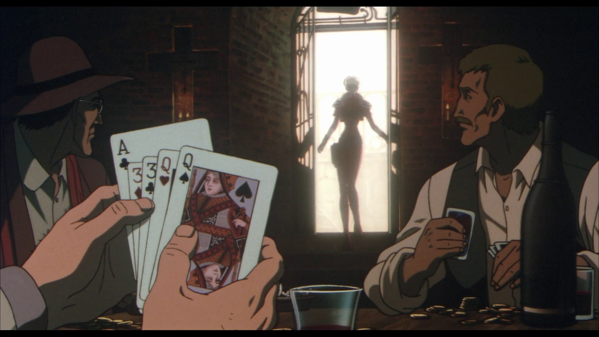 The experience wasn’t helped by deciding to watch the English audio this time, instead of finding a version with English subtitles on the Japanese audio, since this was the original audio track and the intended experience for a film that was made for the American market. While the actors are professionals — Peggy from King of the Hill’s VA is Leila; Kyle’s is even today bouncing around police procedurals on actual TV (Alex Fernandez, the only guy who is actually trying in the whole cast), early career John DiMaggio is in here and mid-career Michael McShane is as well — the voice direction is terrible and the script is, well, it’s still a sloppily-translated dub-level script from the late nineties. At no point in the production did anyone catch that “dhampir” had been mistranslated and bastardized as “dunpeal,” or make any attempt to fix it. Andrew Philpot is atrocious as D; limp, monotone and quiet in the way all these terse, near-silent protagonists were directed to be for years and years up until just recently. Surely Doug Cockle didn’t invent bringing intensity and juice to a tough guy role with relatively few formal words when he began voicing Geralt of Rivia; that seems like something that would be intuitive to the material. But D’s passivity is not only obviously intentional, his voice lines seem like they’re mixed down. Dwight Schultz is here doing two incredibly stock anime villain types — Benge, the incredibly manic jester-type who laughs so much he struggles to get his actual lines into the frames of animation provided, and the elder of Barbarois, who speaks in an incredibly rushed old man monotone. They’re aggressively fine. Most everyone here who isn’t outright bad is aggressively fine. A whole lot of these actors would end up as English vocal talent for the Final Fantasy X dub a year later, so imagine a slightly less stilted but also more aimless and less enthusiastic version of that and you understand what the Vampire Hunter D: Bloodlust original cast recording is working with.