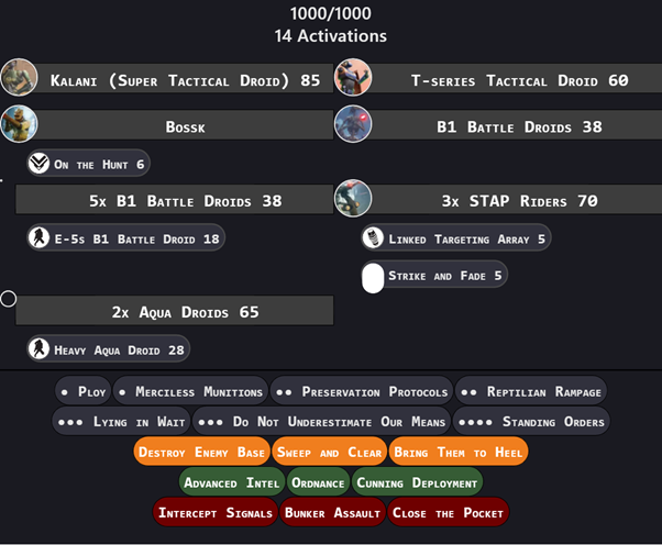 Despite the list being full of white saves, apart from Kalani, it is packed full of wounds – 99 to be exact. Concentrated fire power is needed to chew through the number of bodies. Beating 3 other CIS players and 2 GAR players along the way, including 6 force users, the Aqua Droids continue to show why they are one of the top units out there right now.