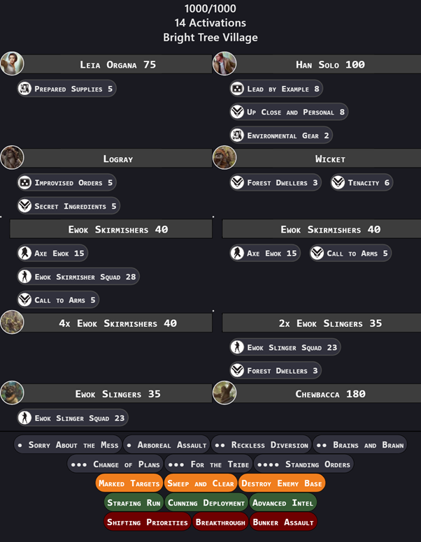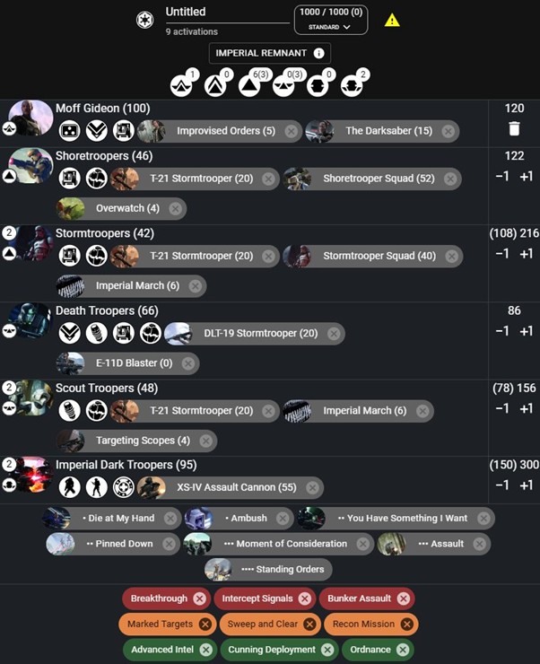 - It’s a list that likes to be spread out as units get free tokens for being beyond range 2 of their commander (currently Moff Gideon is the only available commander).