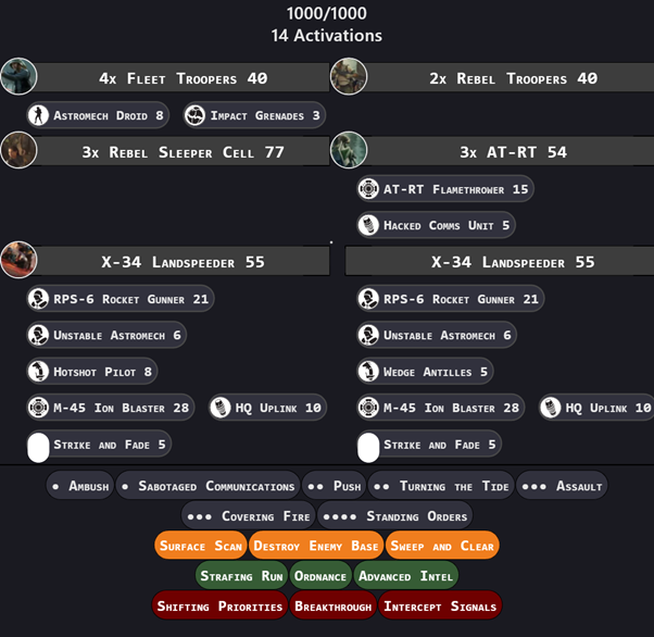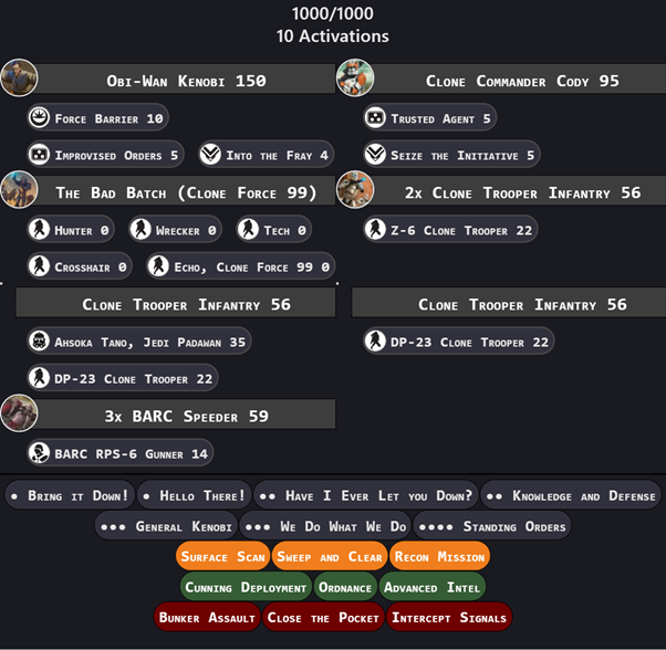 All 10 of these activations have a job to do. All four Clone Infantry units are kitted out with heavy weapons (and a Leader in the form of Ahsoka Tano, Jedi Padawan for one of the units), there would have been plenty of opportunities to roll dice against his opponents. Three BARC Speeders need a skillful and tactful hand. Getting the balance right of not overstretching them so that they get shot and die to a stiff breeze whilst, but keeping them useful and ready to jump on a POI when ready is not easy. Fortunately there are distractions in the list to take opponents’ focus away from the Speeders in the form of the Bad Batch, Obi-Wan and the Ahsoka Clone Infantry squad. The list would excel at the Close the Pocket and Intercept the Signals, with the former making up half of Coltan’s games at the event. With the Clone ball sticking together and trying to hold the double scoring centre POI on Close the Pocket, the BARCs and The Bad Batch can use their manoeuvrability to strike at the side POIs and at least contest them to stop the opponent scoring or hope to overload one to get a 2-point swing going each round. Obi-Wan provides a defensive reassurance to the token-sharing clones and Cody provides support to the BARCs through Direct and Observe helping to keep the rerolls going.