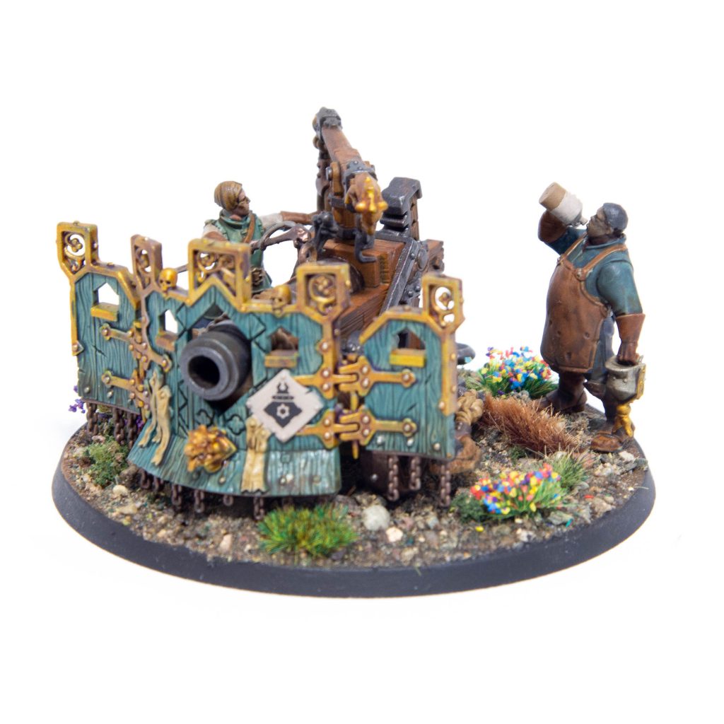The Cavaliers and Cannons make up the majority of the damage in the army, allowing the cannons to pelt opponents from afar while denying them a way to get into combat. The Cavaliers can then deal with anything that can’t be dealt with by shooting at it, and then be teleported back to the Pontifex’s side. Freeguild Corps can be spread out to deny movement and tax your opponent’s command point usage with their warscroll ability..