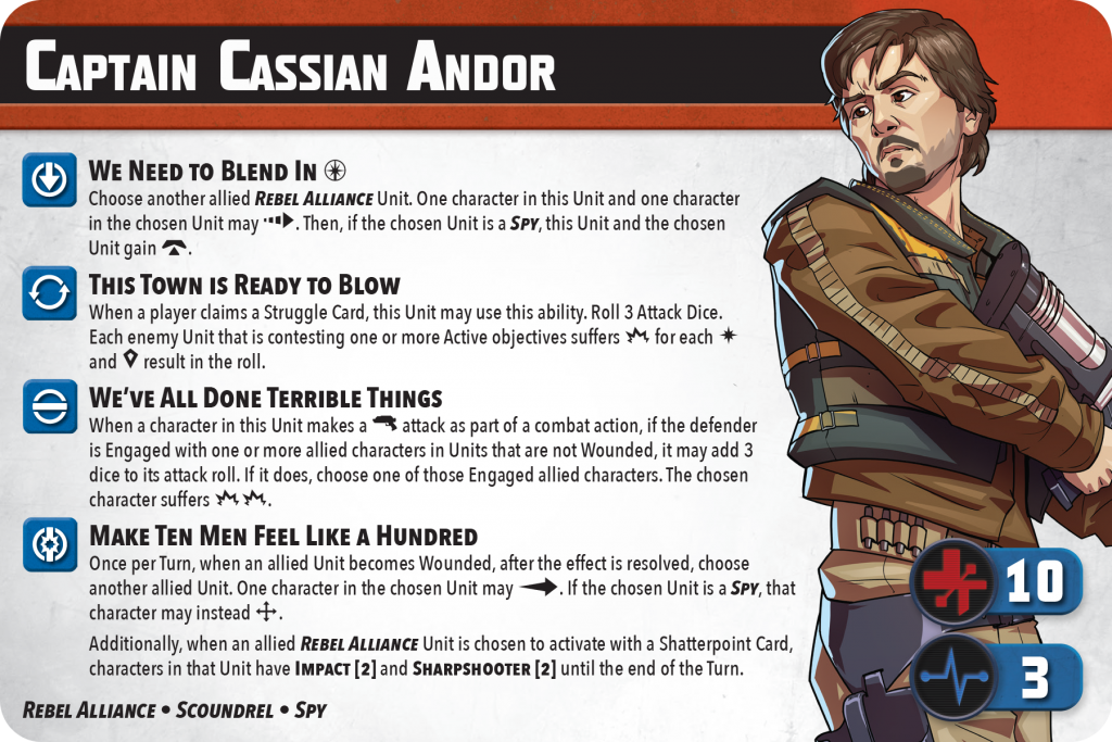 Cassian has three main abilities We Need To Blend In allows Cassian and another rebel to dash and maybe gain a hunker. Unlike most primaries this is an active ability that costs force instead a start of turn tactic. This Town Is Ready To Blow is Cassian’s main offense. In a perfect world it can do 18 damage to the opposing team but in practice it is usually 8 or 9 which is still more than a full attack from most units. You don’t get to carry over the momentum if you wound into the next struggle, but if they cannot score, that is a win for you. However, the real reason you are taking Cassian is Make Ten Men Feel Like a Hundred, this is hands down the best revenge movement ability in the game. It allows you to advance or reposition any unit on the board. You will almost always be able to push someone back on the point when your opponent wounds a unit or take an unprotected back point. Often this unit will have Lockdown or break ties with Imperial Mandate or Thanks For Doing The Heavy Lifting. The second part of this identity gives any rebel unit Sharpshooter [2] and Impact [2]. Most of the time this will translate into one or two additional steps on your tree, if you can focus. Most of the time it is rebel commandos that will be able to take advantage of this, however Princess Leia is good shatterpoint target if she is your other squad. Cassian’s final ability is We’ve All Done Terrible Things is his least used and gives him a little offense but, more importantly, it can wound one of your units allowing Make Ten Feel Like a Hundred to trigger.