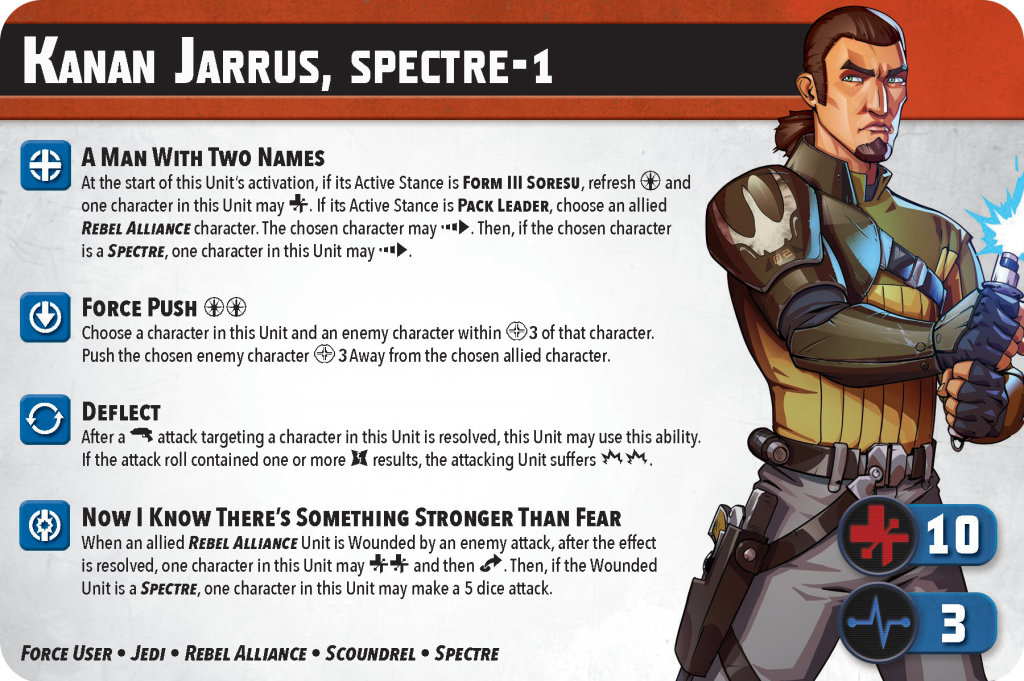Most people are already familiar with Rebel Commando. Infiltrate lets you get on points early and Coordinate Fire can ping a unit when another rebel attacks. Given that no one has amazing damage output this can be vital to putting opposing units to sleep. But the real reason you are taking them is because they are amazing shatterpoint targets. Most people like to activate primary units with their shatterpoints but getting 2 10 dice attacks and having 2 bodies move is pretty amazing. It isn’t uncommon for them to both get their full tree and go the heal route for 6 heals, 10 or 11 damage and 4 shoves. Just be careful about an early shatterpoint resulting in the commandos getting wounded twice the first time through the deck and spending too much force on them once they are wounded. It is often worth taking the risk but don’t get so blinded by the short term gain that you lose the game as a result.
