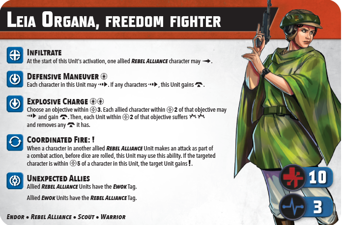 The first list will be the “power/offense” list. Rebels in general aren’t the most offensive faction but there is one primary that buffs the offense the most, Freedom Fighter Leia and Coordinated Fire: Expose. She also helps our movement but giving a rebel a full advance while having Defensive Maneuvers to dash herself. For her secondary, I’ll choose the newly upgraded C-3P0 and R2 unit. Again they bring out of activation movement and since everyone in the list is an ewok can give them scale or steadfast. Their personal offense is still horrible but their ability to remove conditions from other units can increase their friends’ offense significantly. The support slot comes down to Ewok Hunters or Rebel Pathfinders. Pathfinders have better range, speed, and expertise but the Hunters do more damage, roll more dice and bring a third coordinate fire. I am going to choose the ewoks because they have better damage and this is the offensive list, Coordinated Fire: Pin is also basically a free damage as there is a lot of early pins on your tree. I have never gotten close to living the dream but they have the potential to roll 16 dice with both attacks thanks to Cassian and Strength In Numbers. Most likely you will get 10 or 11 which is still great.