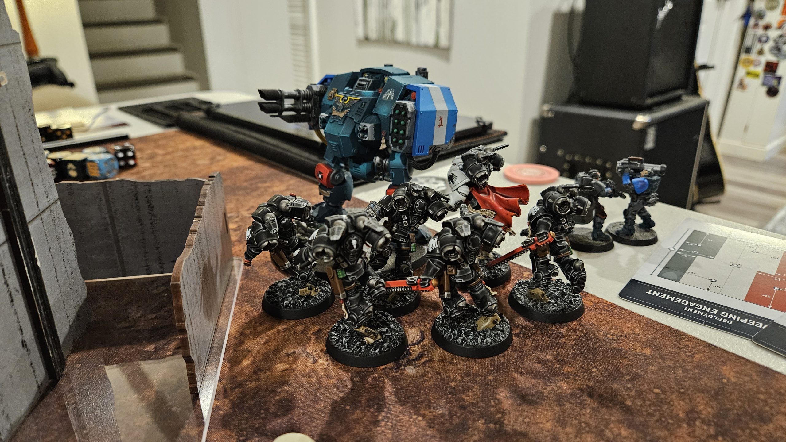 - Into Darkness (1 CP): Two Phobos or Scout units or one Adeptus Astartes infantry unit can leave the battlefield and go into Strategic Reserves as long as they’re not in Engagement Range of an enemy unit. Ah yes, the “uppy-downy” strat. Critical to this Detachment’s success, this will allow you to get your heavy weapon infantry into position to do as much damage as possible. You’ll probably use this 4-5 times per game, with most or all of them being discounted by Shaan. You may be thinking that Scouts already have this ability innately, but it’s important to note that this can be used to get a unit that’s within 6” of an enemy unit, which turns off their innate ability. Fun fact: The Invictor Warsuit has the PHOBOS keyword.