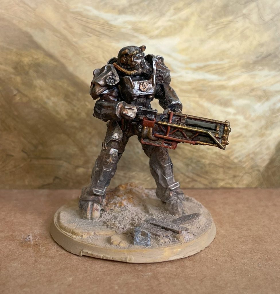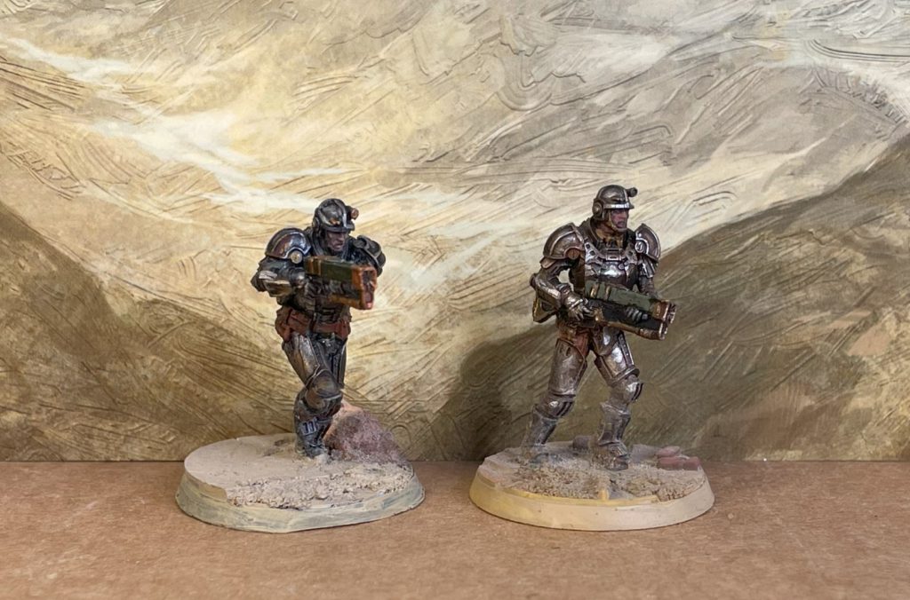 I painted these following (mostly!) SRM’s How to Paint Everything: Brotherhood of Steel guide, subbing in oils for his brown washes to go for a patina of dirt instead of rust. It’s a good guide, go read it!